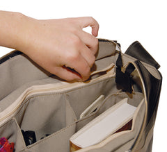 A harmonious balance between unique style and practical design this Busy Bag features a sage green removable and washable compartmentalized interior that precisely provides a pocket for everything from keys to an extra pair of sandals.