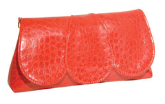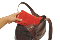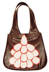 Funky and functional, the Droplet Bag elicits attention and excitement. Handmade droplets of red and white vegan crocodile leather are individually sewn on to an espresso brown bag. The interior features a red “crocodile leather” breakaway clutch that is sure to snag some attention.